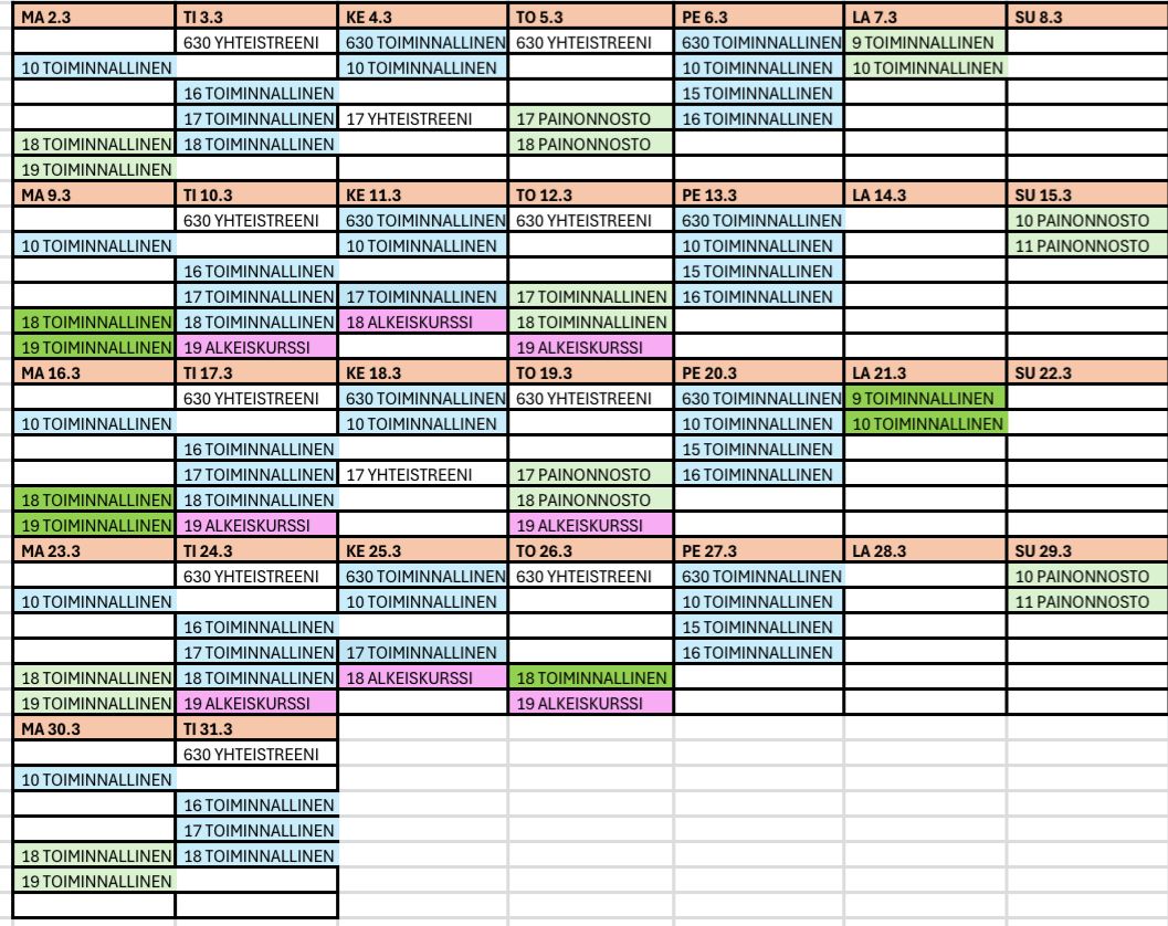 Tuntikalenteri ja aikataulu ovat alustavia ja SAROFit Oy pidättää oikeuden muutoksiin. Tuntikalenteria kehitetään aktiivisesti kysynnän ja palautteiden mukaan.